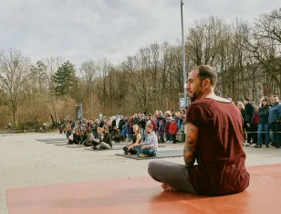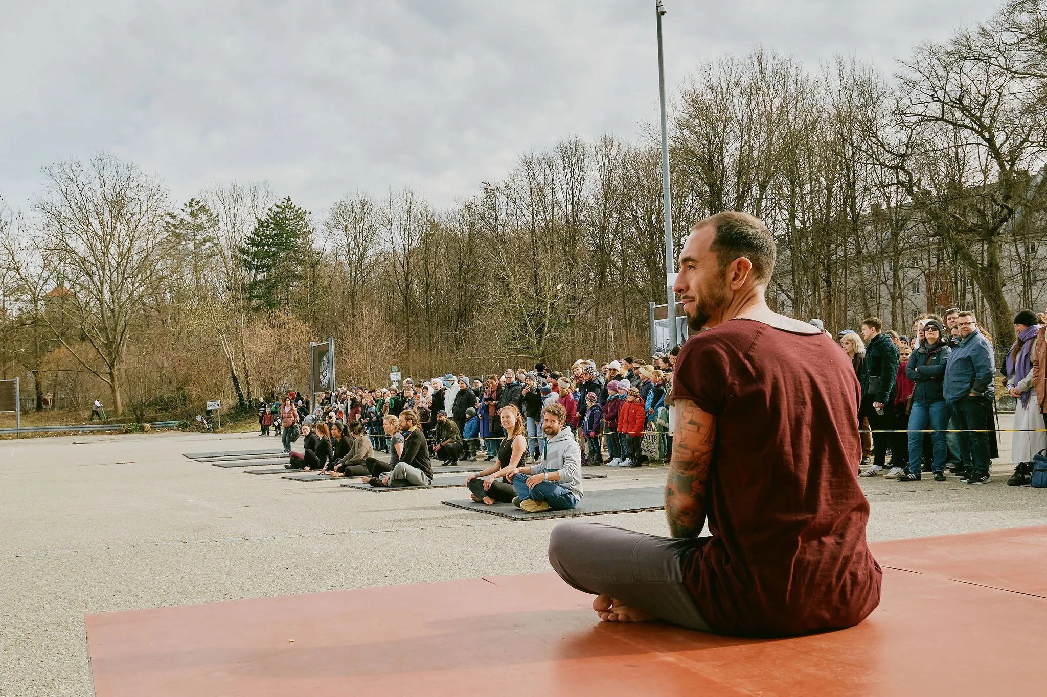 Wenn der Lauf der Geschichte in keine Zukunft mehr führt, muss er aufgehalten werden. So wie die historische Turnbewegung ihr Körpertraining mit einer politischen Idee verband, war auch dieses Turnfest eine politische Geste: Mit Kraft, Spannung und Schwung haben wir uns auf gegen den Lauf der Geschichte aufgebäumt. Zahlreiche Augsburger Sportvereine und -gruppen präsentierten sich in einer großen Choreografie. Die Philosophin Eva von Redecker hielt eine „Rede an die Menschheit ohne Zukunft“. Der serbisch- orthodoxe Theologe Nenad Živković und die evangelisch-lutherische Theologin Snewit Aujezdsky waren eingeladen, Impulse für eine kritische Auseinandersetzung mit den Polykrisen der Gegenwart zu formulieren.