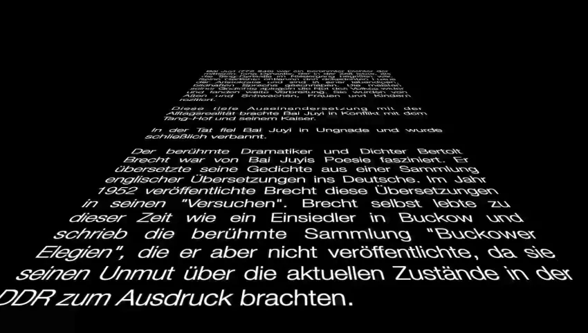 B. solo B. geht der Frage nach, was Exil ist. Ist das Exil lediglich eine materielle Veränderung in Zeit und Raum? Oder ist es eine Veränderung des menschlichen Geistes? Die Antwort findet man, indem man Brechts Dialog mit Bai Juyis Gedichten lauscht.