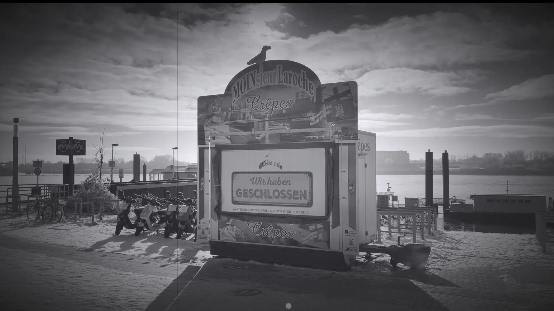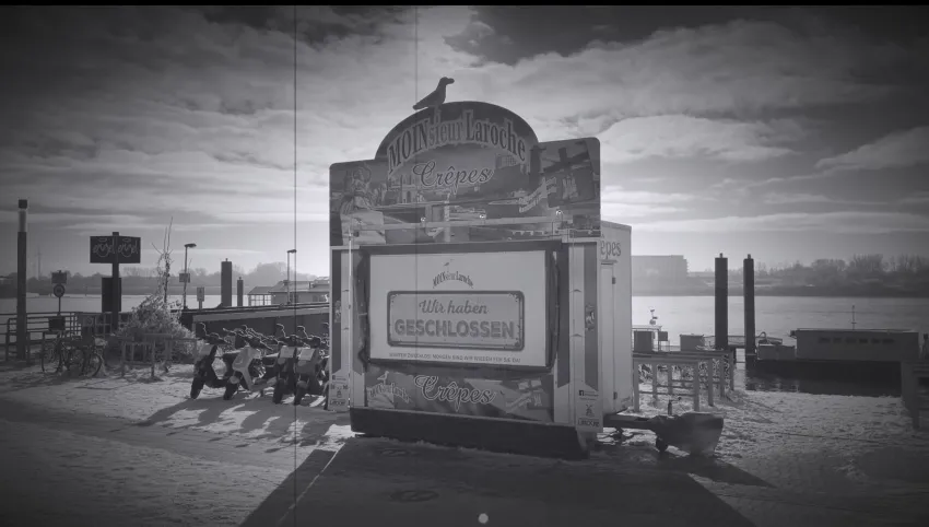 „Direkt zu Brecht geht es bei Beckmann und Hübner in dem „HelliBert &PandeMia“ übertitelten Filmbeitrag. Beckmann und Hübner lesen Briefe, die sich Brecht und Weigel geschrieben haben. Es geht um das Austarieren der eigenen Beziehung, aber auch um das Leben und Überleben im Exil. Dieser schreibenden Zwiesprache werden Bilder Hamburgs gegenübergestellt. Eine frühe Radionachrichten-Einblendung der Gegenwart legt nahe, dass diese während des Lockdowns im Januar oder Februar aufgenommen worden sind. Mal sind es Blicke auf Hafenanlagen an der Elbe, dann ein kaum genutztes Passagierschiff, die verlassene Reeperbahn. Zusammen führt das zu einem anderen zuhören. Denn so wie jetzt während der Pandemie der auf den Kopf gestellte Alltag irgendwie weitergeht, war das auch bei Brecht und Weigel im Exil. Da ging es dann minutiös und haarklein um Filmprojekte, die sich dann doch zerschlagen haben, während in Europa und im Pazifik der Krieg tobte.“