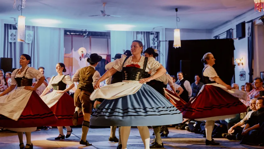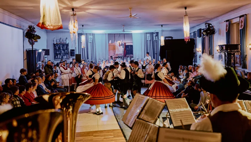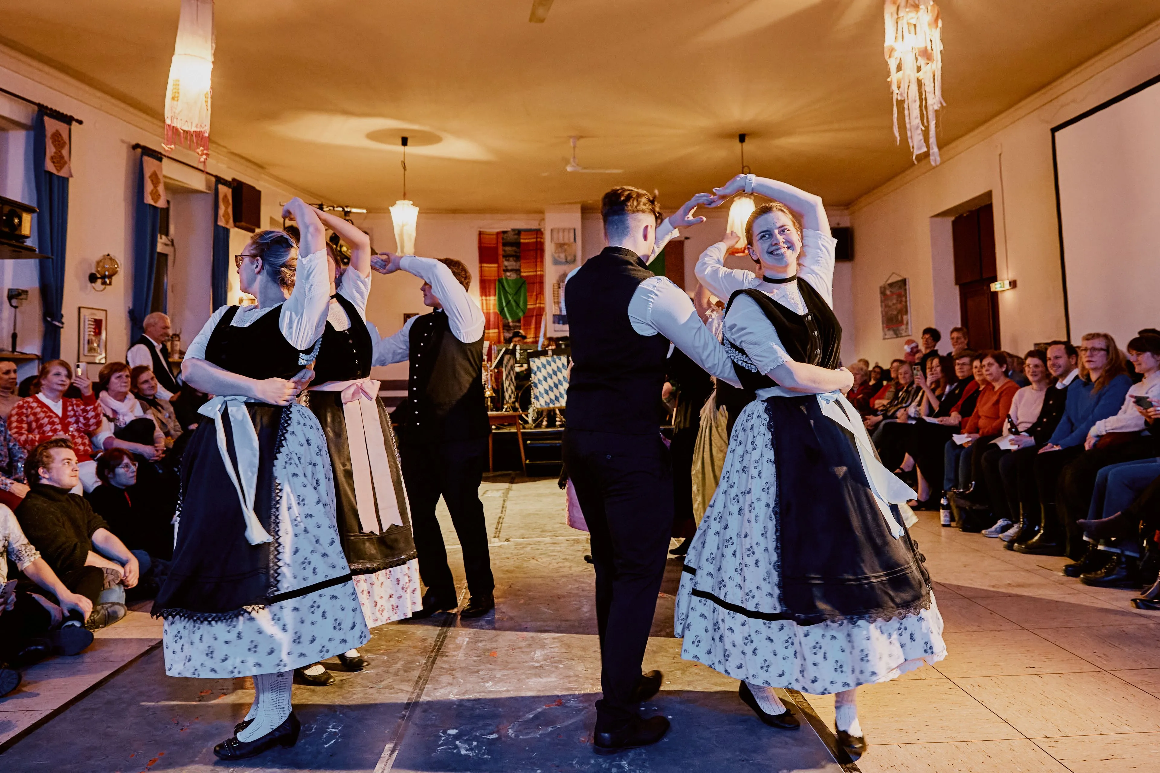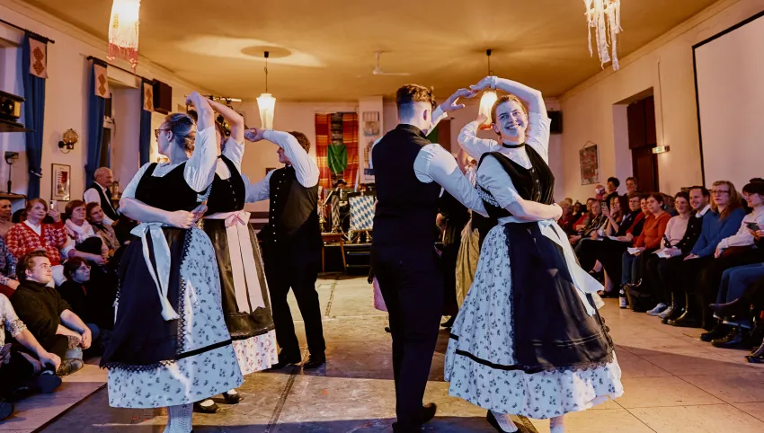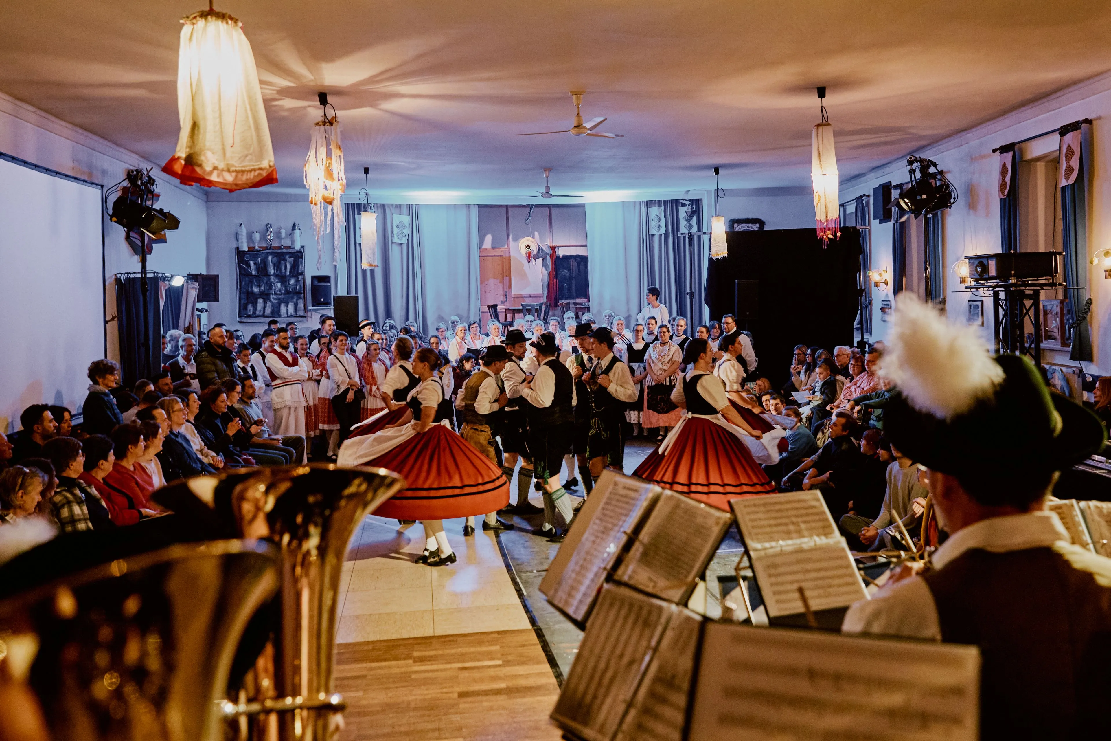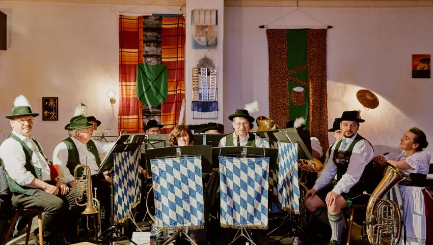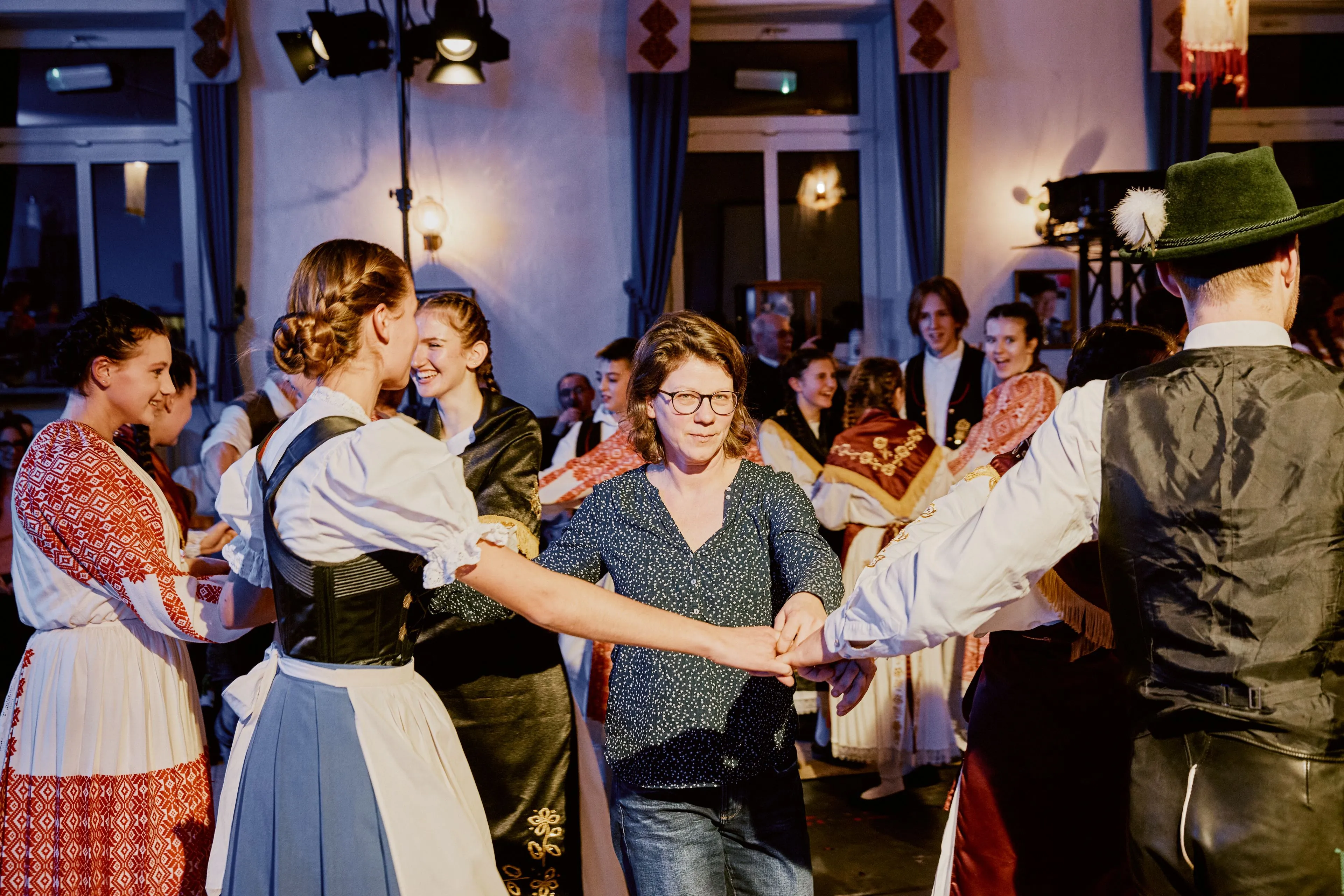 Der Saalbau Krone fungiert als Lokal des Oberbayrischen Volkstrachtenvereins. Gegründet wurde er 1905 von Menschen, die vom bayerischen Oberland nach Augsburg gezogen waren, um dort in den Industriewerken zu arbeiten. Sie brachten ihre lokale Tanz- und Musiktradition mit, die bis heute, mehrere Generationen später, mitten in Lechhausen gepflegt wird. Andere, und doch ähnliche Entstehungsgeschichten haben auch die Tanzgruppen der Banater Schwaben und der Kroat*innen, beide ebenfalls in Lechhausen angesiedelt. „Ankommen, Weitertanzen“ reflektiert diese Geschichten und präsentiert eine Lechhauser Heimatfusion mit Kapelle und Kolo, Platteln und Drah’n - mit Einladung zum Mittanzen!