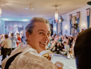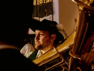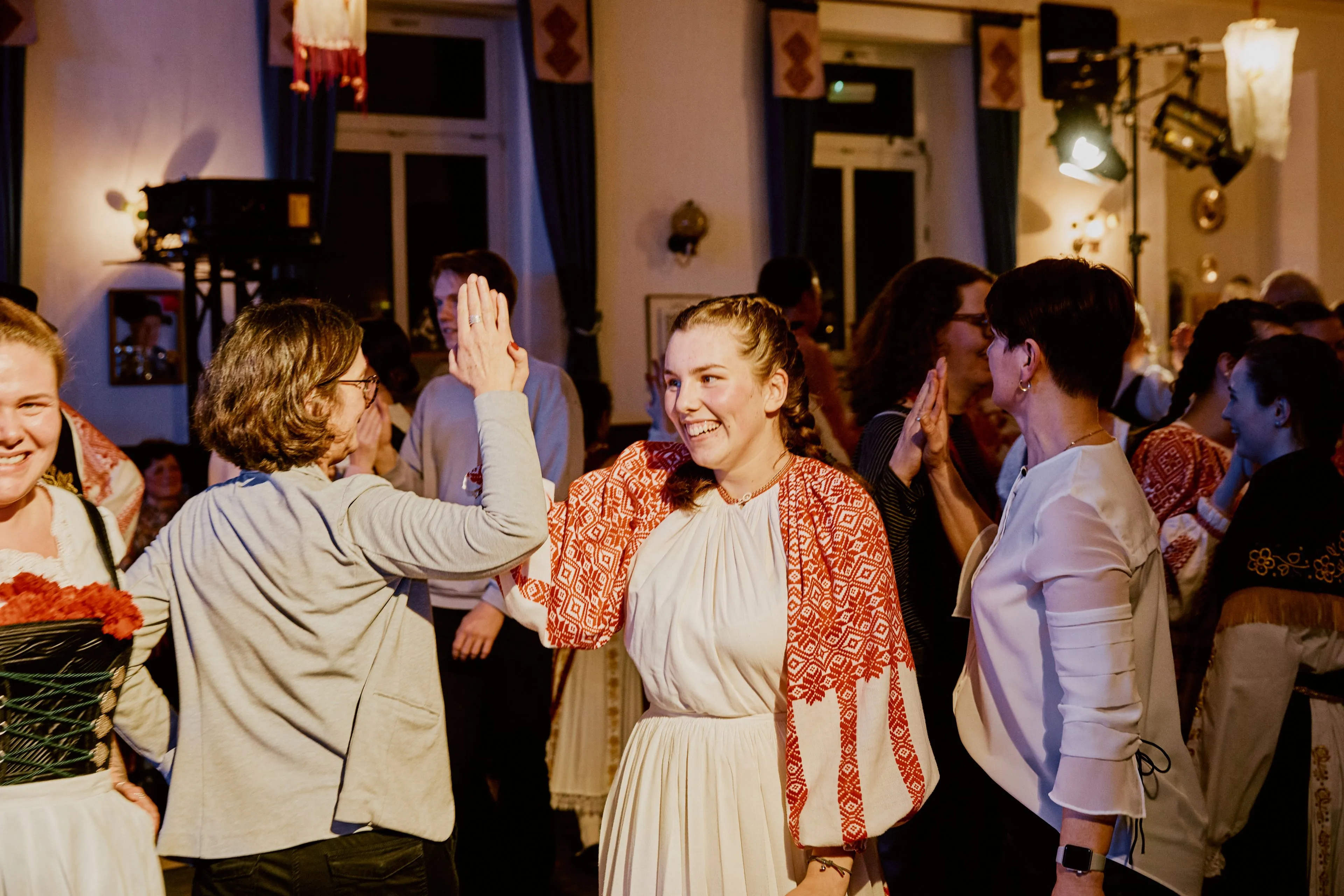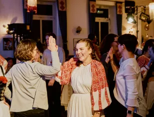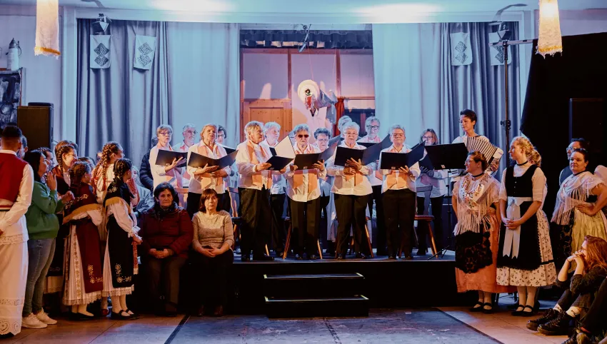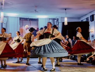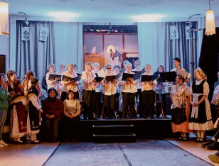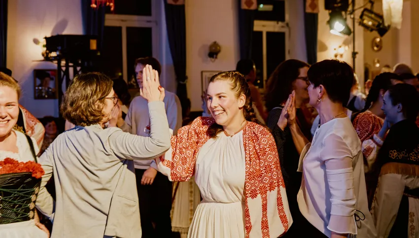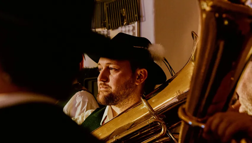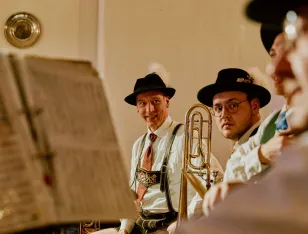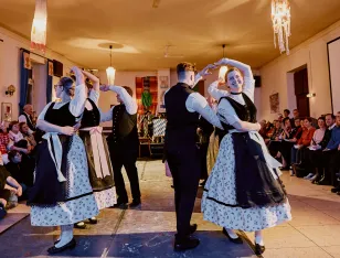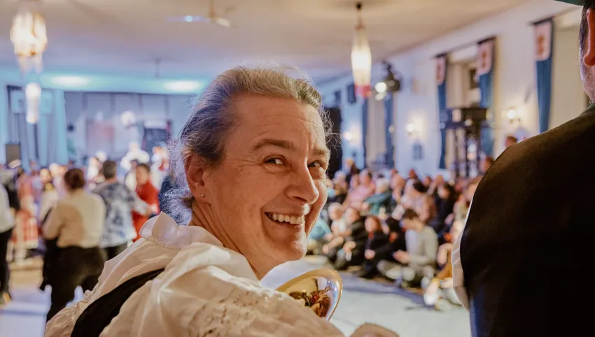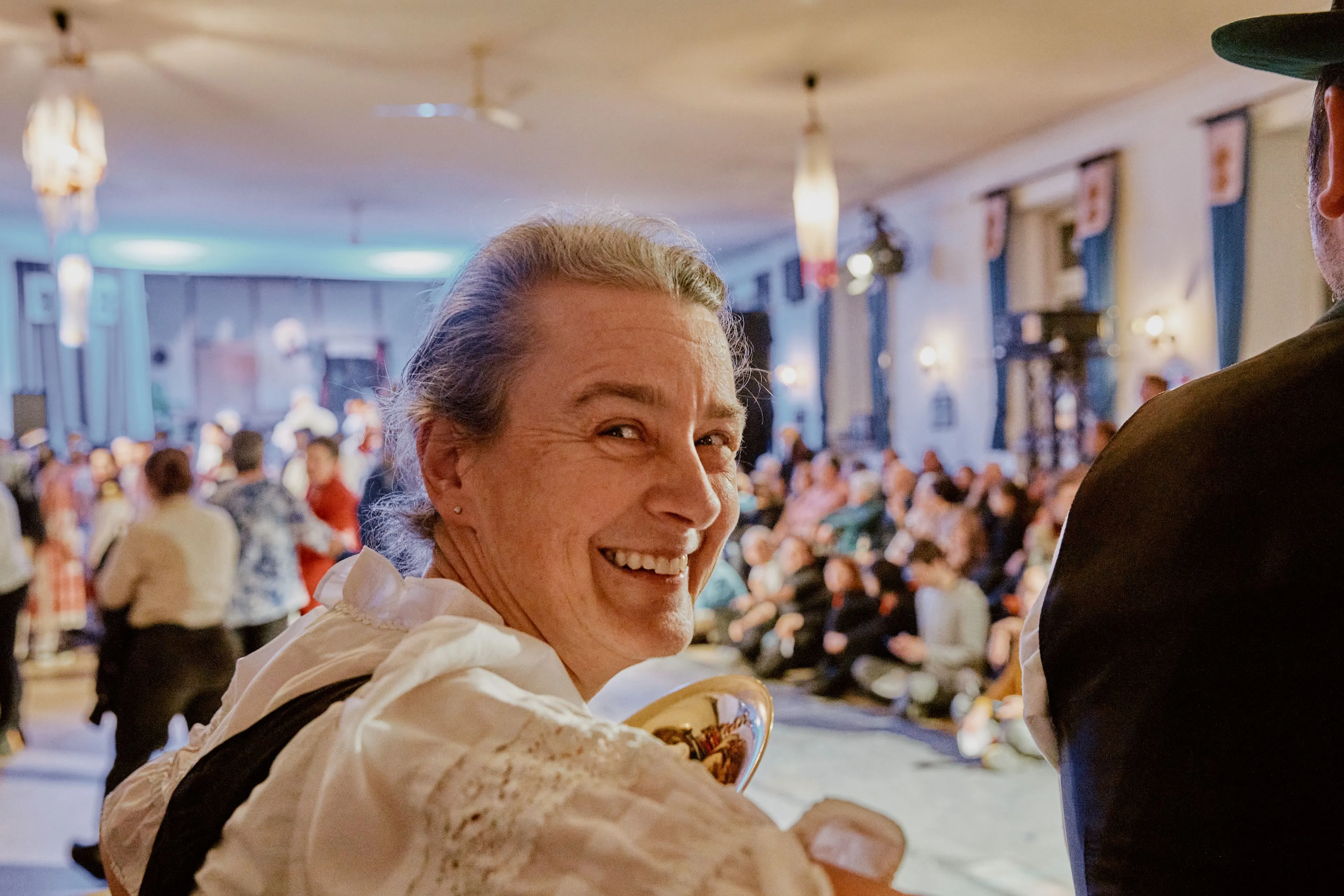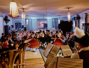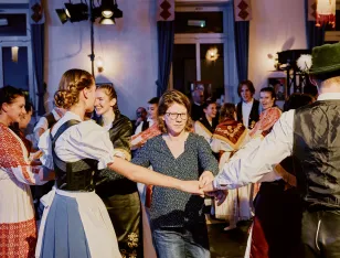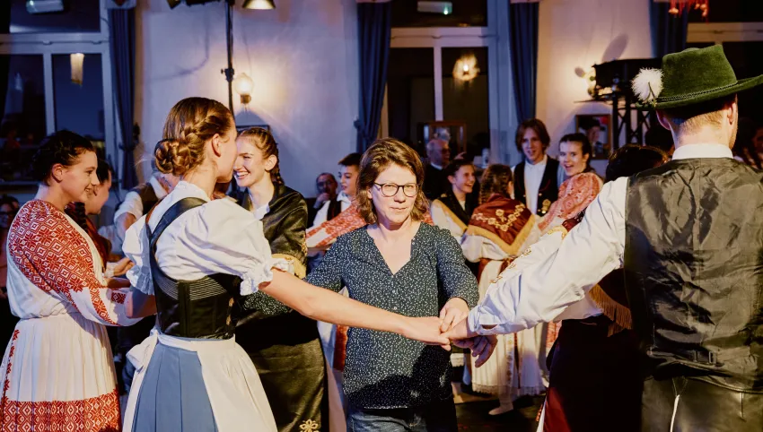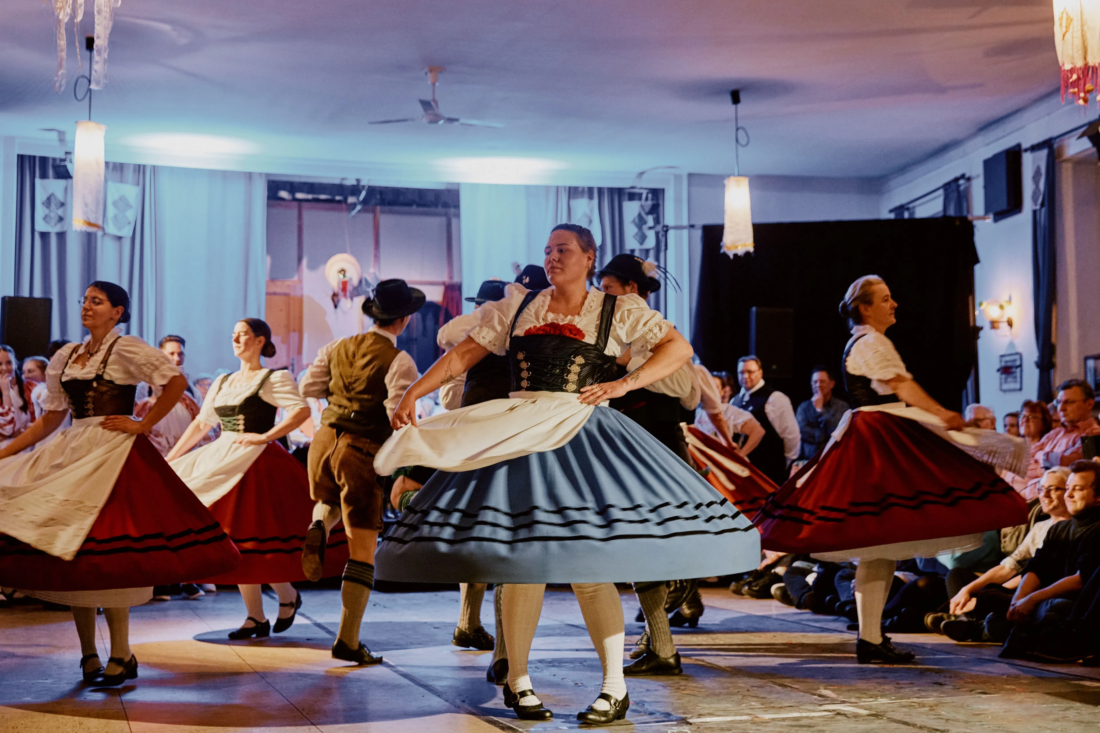 Der Saalbau Krone fungiert als Lokal des Oberbayrischen Volkstrachtenvereins. Gegründet wurde er 1905 von Menschen, die vom bayerischen Oberland nach Augsburg gezogen waren, um dort in den Industriewerken zu arbeiten. Sie brachten ihre lokale Tanz- und Musiktradition mit, die bis heute, mehrere Generationen später, mitten in Lechhausen gepflegt wird. Andere, und doch ähnliche Entstehungsgeschichten haben auch die Tanzgruppen der Banater Schwaben und der Kroat*innen, beide ebenfalls in Lechhausen angesiedelt. „Ankommen, Weitertanzen“ reflektiert diese Geschichten und präsentiert eine Lechhauser Heimatfusion mit Kapelle und Kolo, Platteln und Drah’n - mit Einladung zum Mittanzen!