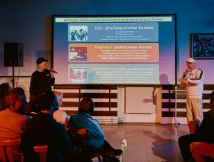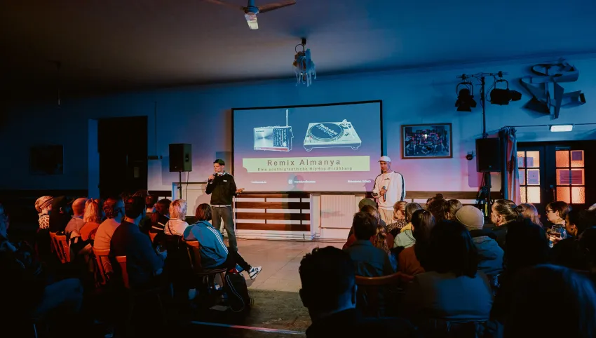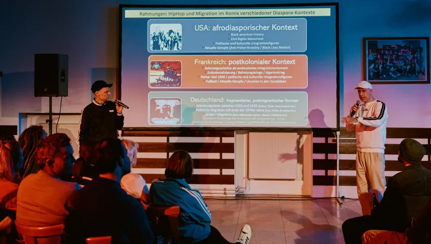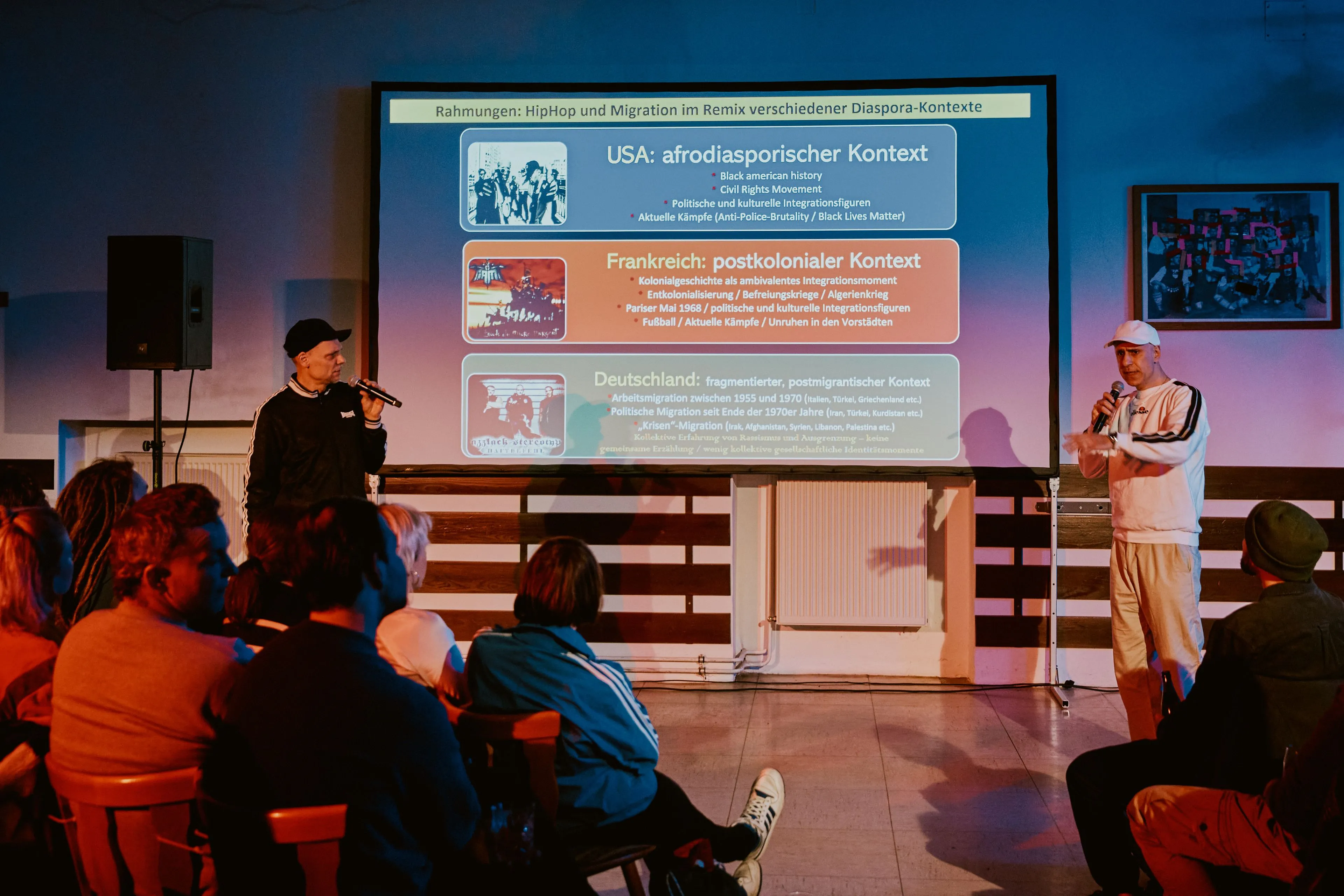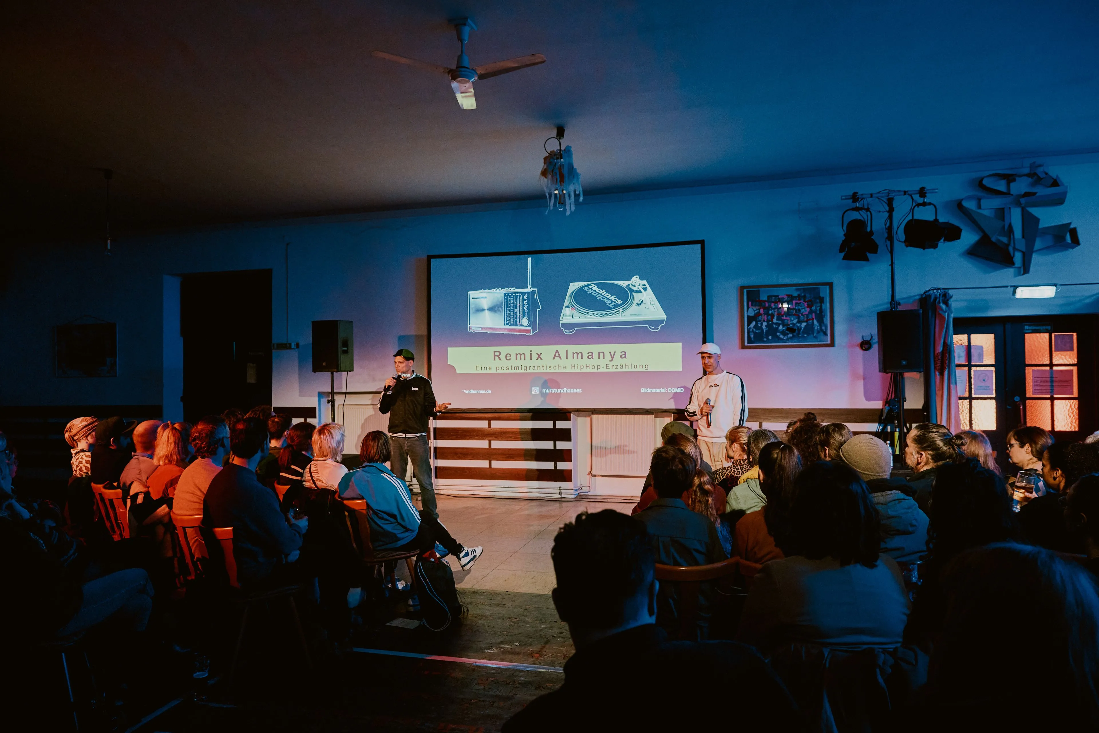 Murat Güngör, Ex-Rapper und Mitbegründer des antirassistischen Netzwerks „Kanak Attak“ und Hannes Loh, ehemaliger Rapper bei der Gruppe „Anarchist Academy“, lassen in ihrer Lecture die Anfänge des deutschen Hip-Hop aus der postmigrantischen Szene Revue passieren – u.a. mit Tracks von Metin Türköz, Advanced Chemistry, Eko Fresh, Haftbefehl oder SXTN.