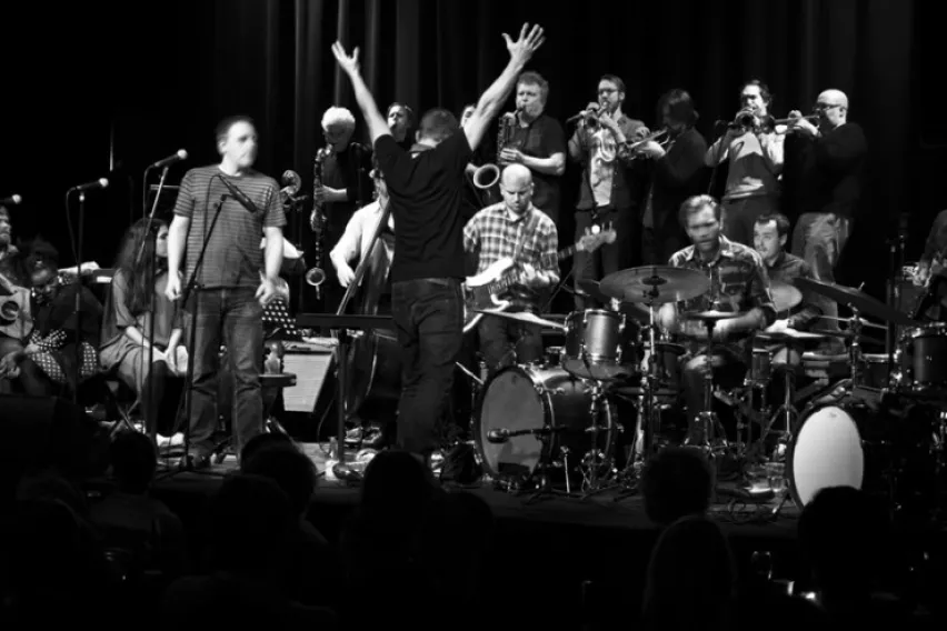Free Jazz, Neue Musik, zeitgenössische Klassik, Noise, Improvisation, ethnische Musik, Volksmusik, Hardcore, Jazz, Electronica, Minimal Music … Für die Schubladen, die man aufziehen müsste, um die Zutaten für das Fire! Orchestra herauszuholen, bräuchte man mehr als eine Schrankwand. Zum Glück kommt dessen Mastermind und Free-Jazz-Legende Mats Gustafsson ganz gut ohne Schubladen aus. Sein neues Projekt ECHOES ist ein Werk von epischem Ausmaß, voller Schönheit, Energie, obsessiver Passagen und Musikalität. Für die Brechtnacht verbindet sich die Kernbesetzung des Fire! Orchestra mit Musikschaffenden aus Augsburg und Umgebung. Aus den Riffs und Melodien von ECHOES erschaffen sie gemeinsam neue Stücke und bringen bis dato nie gehörte Arrangements auf die Bühne.