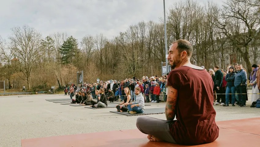 Wenn der Lauf der Geschichte in keine Zukunft mehr führt, muss er aufgehalten werden. So wie die historische Turnbewegung ihr Körpertraining mit einer politischen Idee verband, war auch dieses Turnfest eine politische Geste: Mit Kraft, Spannung und Schwung haben wir uns auf gegen den Lauf der Geschichte aufgebäumt. Zahlreiche Augsburger Sportvereine und -gruppen präsentierten sich in einer großen Choreografie. Die Philosophin Eva von Redecker hielt eine „Rede an die Menschheit ohne Zukunft“. Der serbisch- orthodoxe Theologe Nenad Živković und die evangelisch-lutherische Theologin Snewit Aujezdsky waren eingeladen, Impulse für eine kritische Auseinandersetzung mit den Polykrisen der Gegenwart zu formulieren.