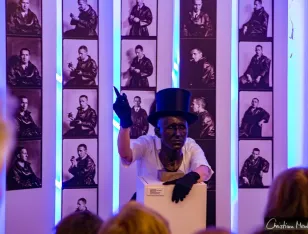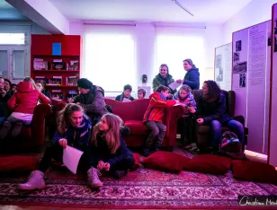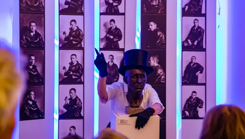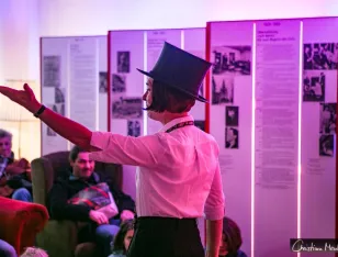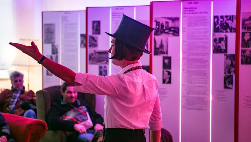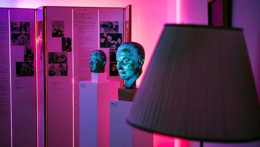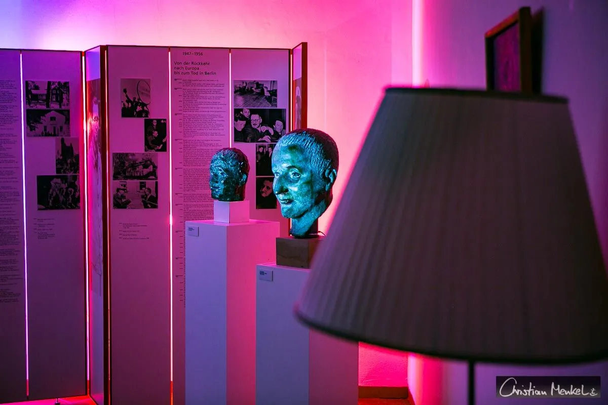 Brecht-Ausstellung zum Sprechen. Das Publikum ist dazu eingeladen, im Raum versteckte Fragmente in Form von Verszeilen und Reimen zu sammeln, um daraus miteinander oder im Alleingang wortschöpferisch kreativ zu werden und etwas Neues zu schaffen. So wird das Museum zur begehbaren Bühne und Brechts Leben und Werk für Kinderaugen und -ohren präsentiert.
