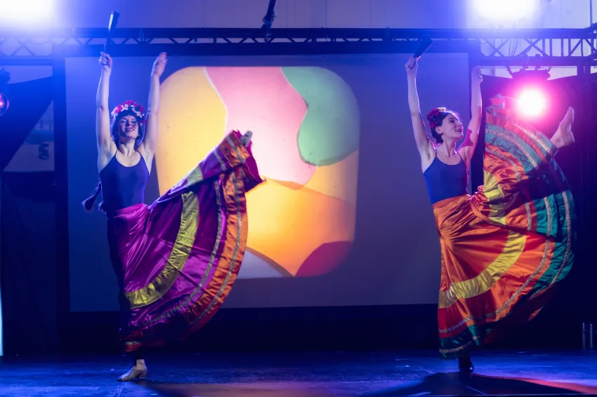 Die beiden Tänzerinnen Johanna Drüszler und Christiane Kuck stellen die Grundformen des Balletts im Training vor. Im Anschluss wird gemeinsam mit den Teilnehmenden ein Ausschnitt aus einer aktuellen Choreografie von Ballettdirektor Ricardo Fernando getanzt.