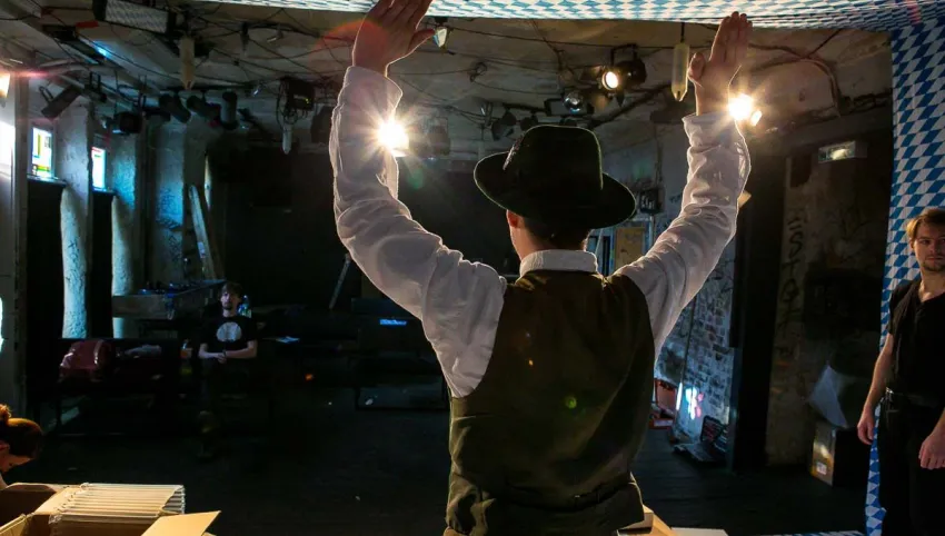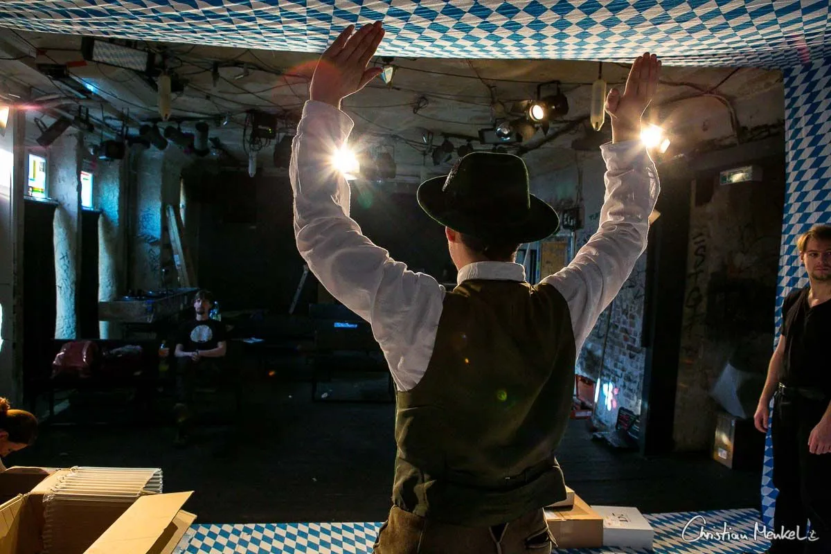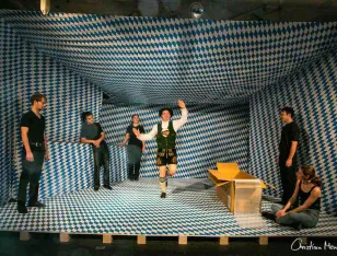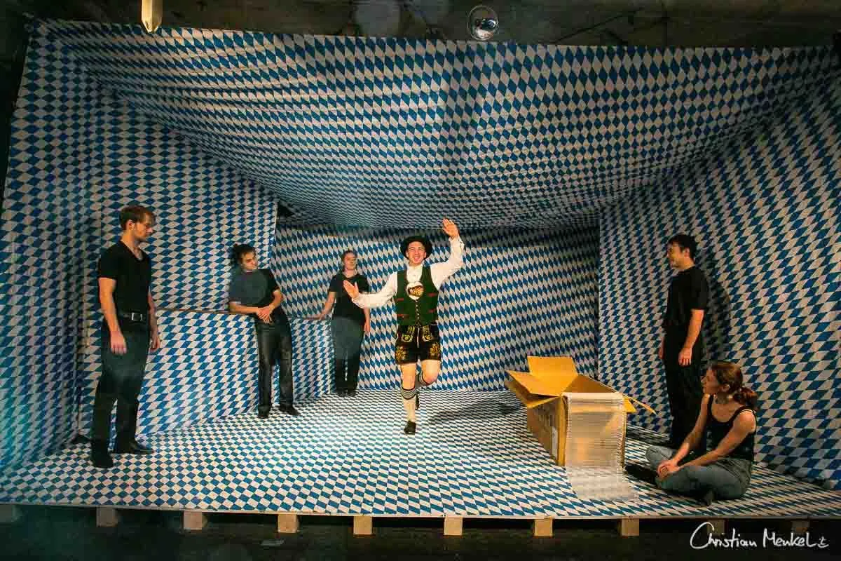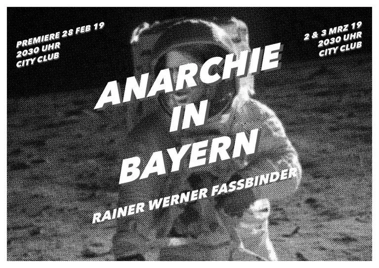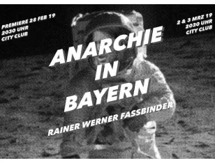 Die Revolution ist heute wie damals für die meisten keine Utopie, sondern ein Schreckgespenst, das für den Verlust von Auto, Geld und Arbeitsplatz steht. Rainer Werner Fassbinder, Theaterberserker, Bürgerschreck und Anführer seines 1968 gegründeten Antitheaters war der festen Überzeugung, dass sich gesellschaftliche Verhärtungen erst dann aufbrechen lassen, wenn sich etwas tut im Bewusstsein der Bürger*innen. Die revueartig montierten Szenen von „Anarchie in Bayern“ gehen davon aus, dass äußerliche Veränderungen nicht ausreichen, um im abendländischen, auf Unterdrückung und Autorität fixierten Bewusstsein etwas zu bewirken. Gesellschaftliche Abstiegsängste sind real. Selbst dann, wenn die ihnen zugrundeliegende Bedrohung oder ihre vermeintlichen Ursachen es nicht sind. Unter der Leitung von Leif Eric Young setzt sich das theter ensemble mit der gesellschaftlichen Kraft von Bedrohungsszenarien auseinander. „Anarchie in Bayern“ ist dabei selbst die Horrorvision, die von verschiedenen Gruppen verwendet wird, um Veränderungen zu verhindern. Alle wollen Sicherheit. Die Frage ist nur: Zu welchem Preis?